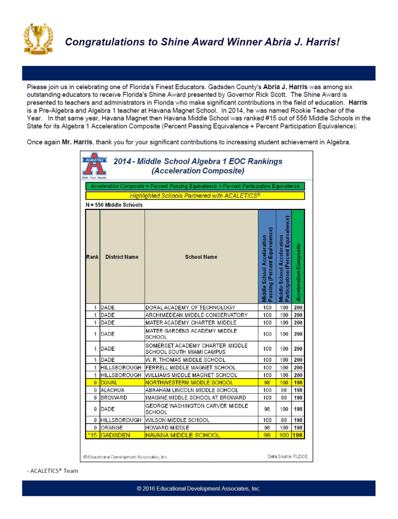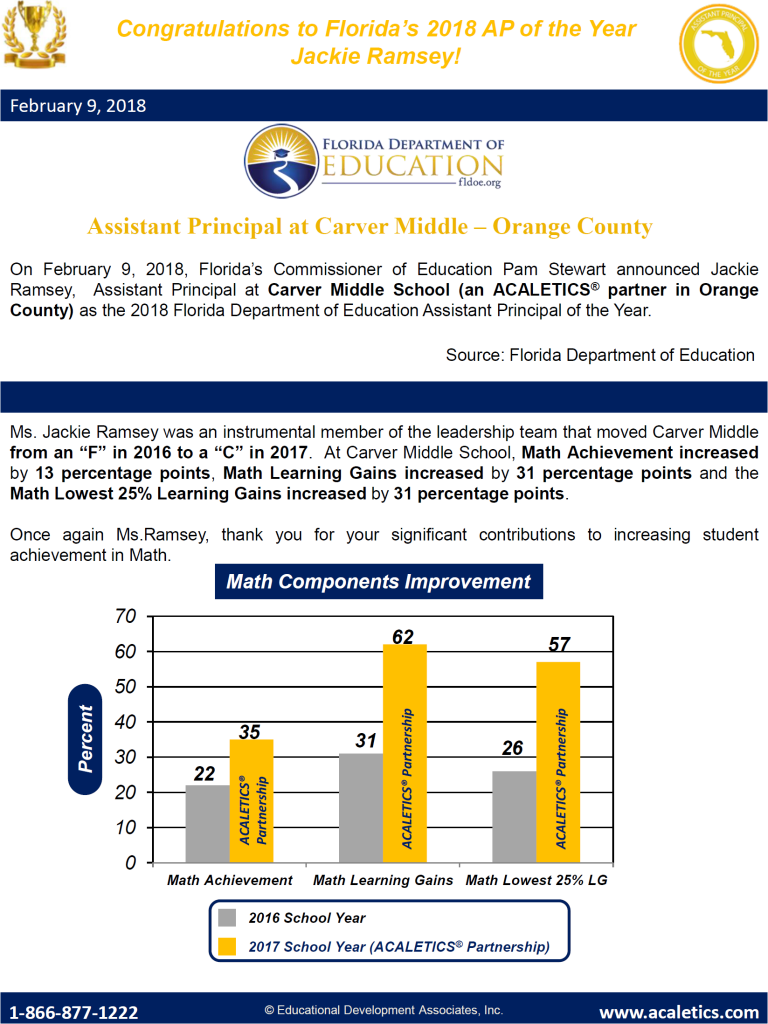 Congratulations to all stakeholders in Gadsden, Dixie and Jefferson counties who made this level of achievement possible. The ACALETICS® team, which provided comprehensive supplemental support to the district’s math program, is proud to be a part of this success and extend best wishes to all.